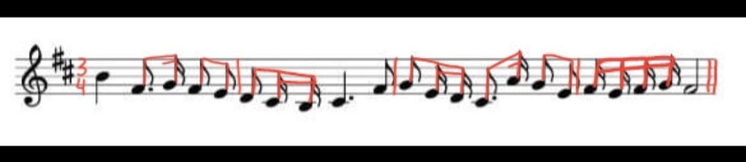 Данную мелодию раздели на такты в размере 3/4. Затем сгруппируй ноты ПО ДОЛЯМ: Hоты которые считаются на 1и - в одну группу объедени, на 2и во вторую, на Зи в третью.