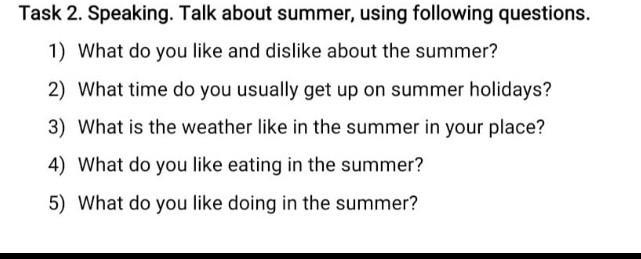 Task 2. Speaking. Talk about summer, using following questions. 1) What do you like and dislike about the summer? 2) What time do you usually get up on summer holidays? 3) What is the weather like in the summer in your place? 4) What do you like eating in the summer? 5) What do you like doing in the summer?