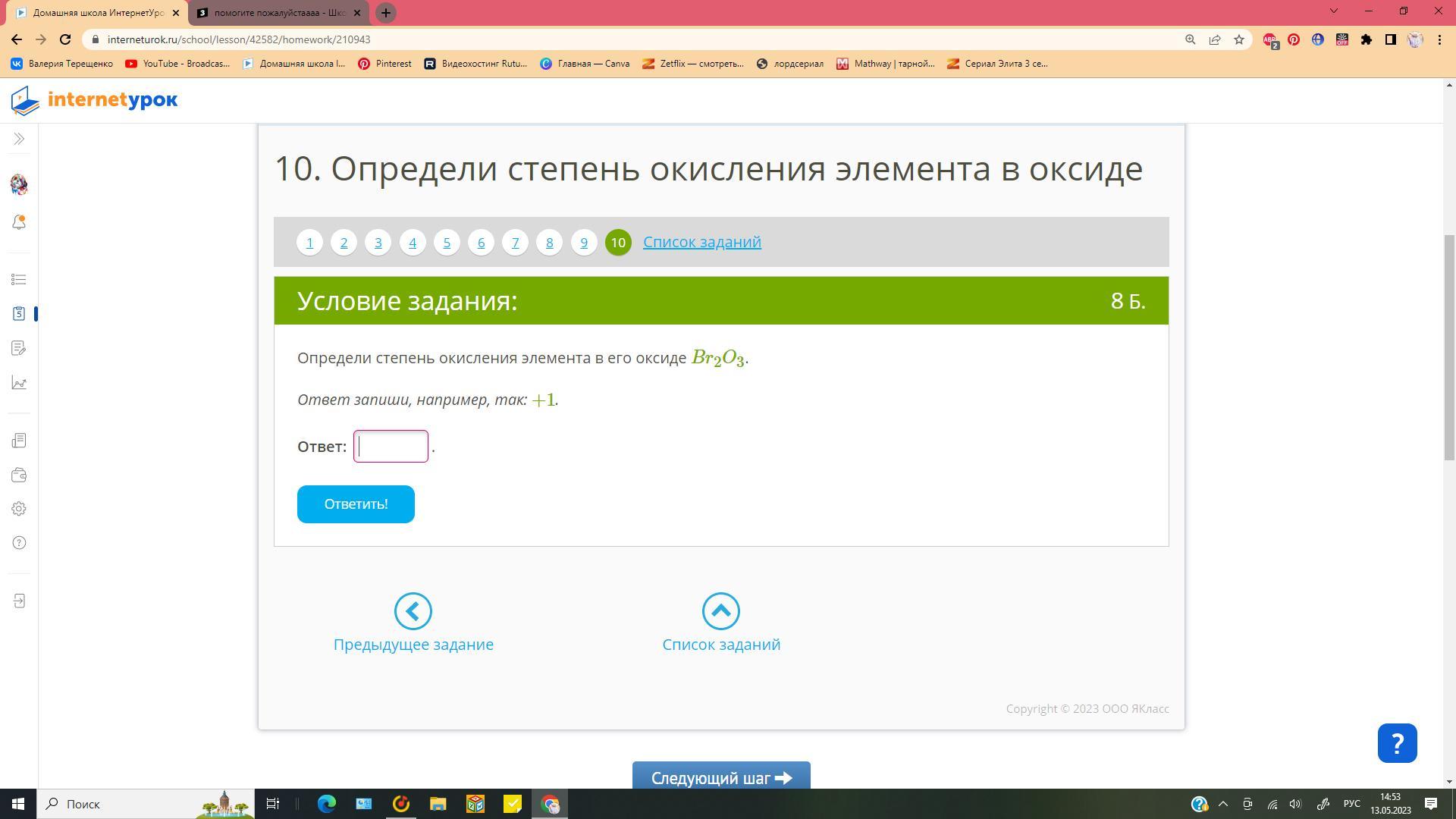 Кислород имеет степень окисления -2, и так как в молекуле 3 атома кислорода, то их суммарный заряд равен -6. Два атома брома в соединении имеют степень окисления +3