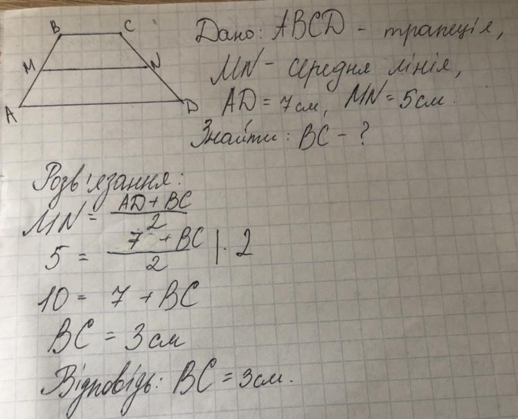 Помогите срочно Довжина більшої основи трапеції дрівнює 7 сма довжина середньої лі