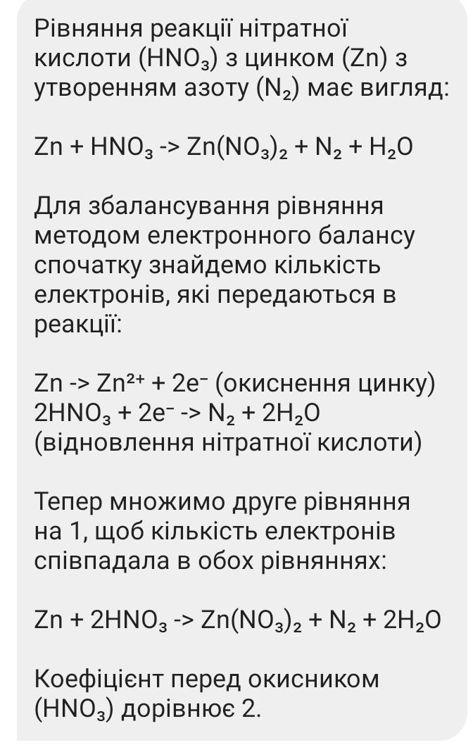 Складіть рівняння нітратної кислоти з цинком, якщо одним з продуктів реакції є азот. Доберіть коефіцієнти методом електронного балансу. Вкажіть коефіцієнт перед окисником.