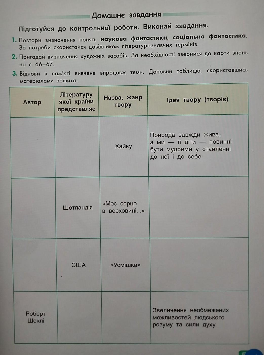 1Автор: Мацуо Басьо . Представляє літературу Японії 2)Автор: Роберт Бернс .Ідея твору: Любов до рідного краю. 3)Рей Бредбері . Ідея твору : показати ,що буде ,якщо люди не будуть змінюватись в хорошу сторону 4)Країна:США назва,жанр твору :Запах думки