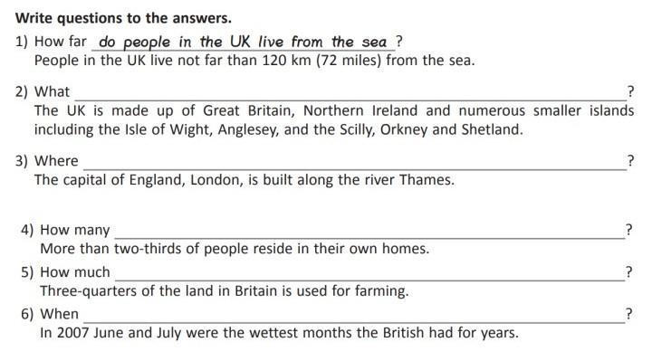 Write questions to the answers. 1) How far do people in the UK live from the sea ? People in the UK live not far than 120 km (72 miles) from the sea. 2) What ? The UK is made up of Great Britain, Northern Ireland and numerous smaller islands including the Isle of Wight, Anglesey, and the Scilly, Orkney and Shetland. 3) Where The capital of England, London, is built along the river Thames. 4) How many More than two-thirds of people reside in their own homes. 5) How much Three-quarters of the land in Britain is used for farming. 6) When In 2007 June and July were the wettest months the British had for years. ? ? ?
