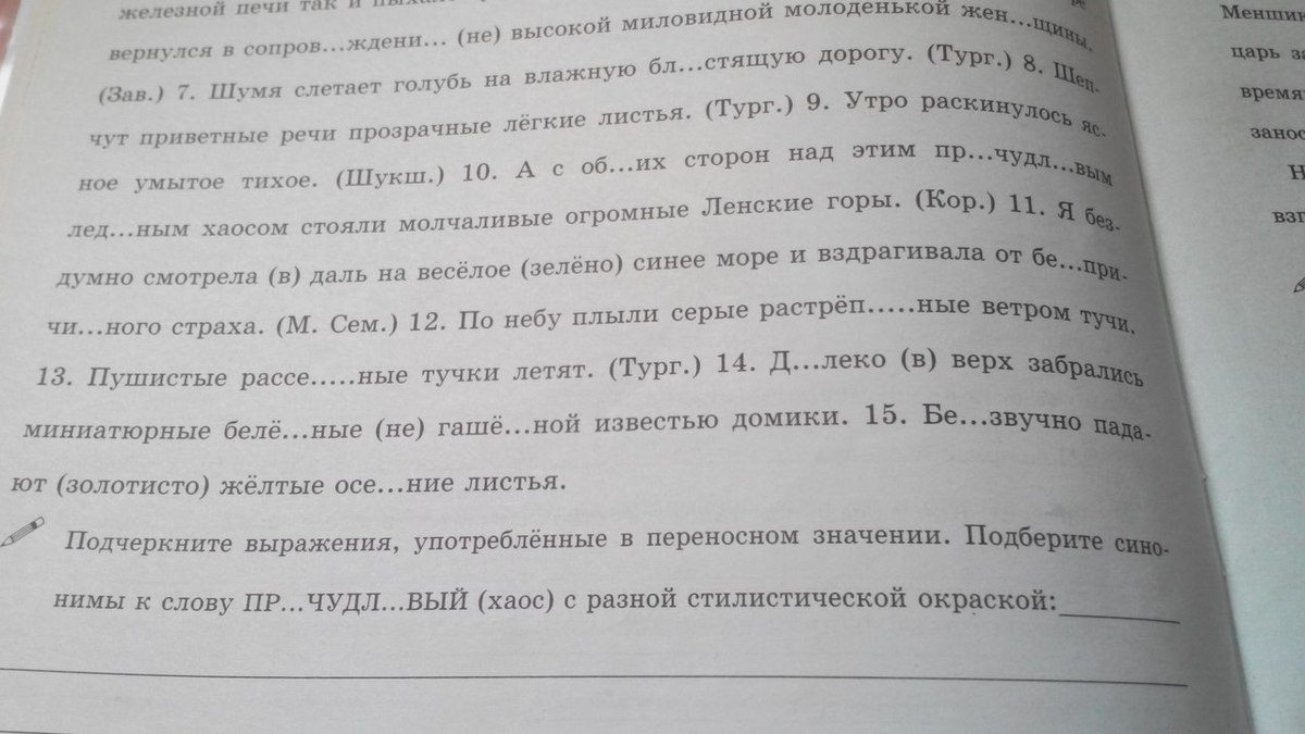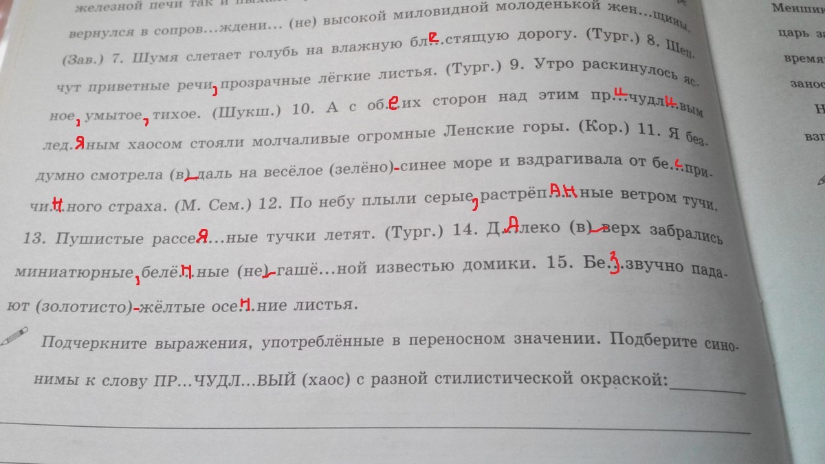 7 предложение-блестящую-блеск.след.строчка после речи-запятая,ясное,умытое,тихое-однородные,.обеих,причудливым,вдаль-вместе,сине-зеленое,беспричинного-с перед глухой,,2н,серые,растрепанные,рассеяные,далеко-даль.вверх,беленные,негашенной,беззвувчно,золотисто-желтые,осенние,нескользкими,точеным,уверенными,тяжелые волны,о камни запятая,сверкая,здесь,высоченным,станционная,натоплена,раскаленной,в сопровождении,невысокой,миловидной,молоденькой-запятые,женщины,блестящую.