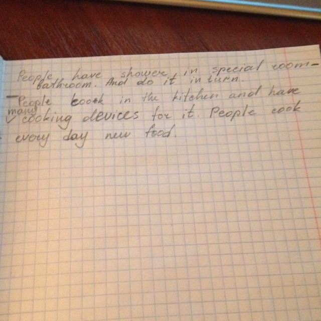 отрицательная форма: People have not shower in special room- bathroom. and dont it in turn. people did not cook in the kitchen and have not many cooking olevices for it. People did not cook every day new food. Вопросительная форма: Did people have shower in special room- bathroom? did people cook in the kithen and have many olevices for it. Did people cook every day new food? Все. Удачи!
