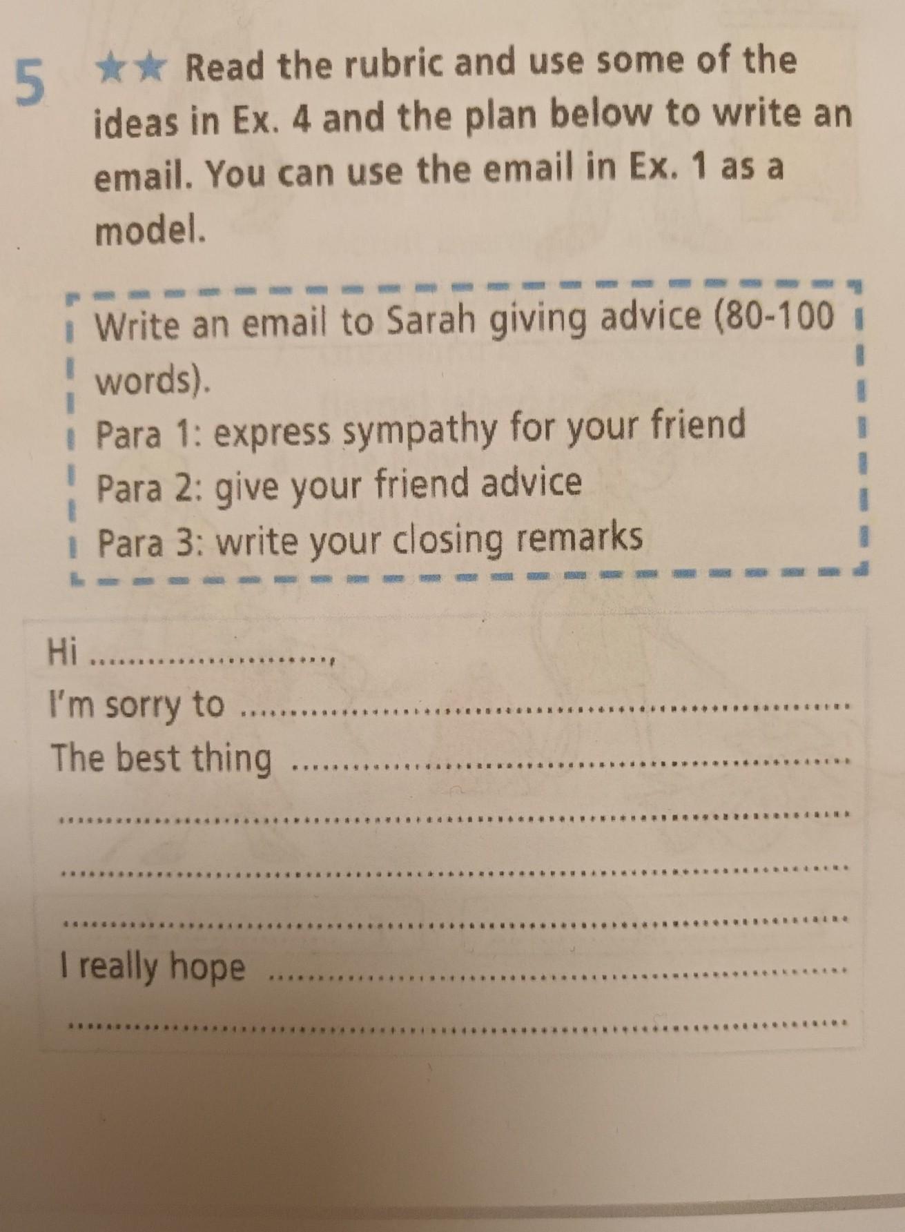 5 ** Read the rubric and use some of the ideas in Ex. 4 and the plan below to write an email. You can use the email in Ex. 1 as a model. I Write an email to Sarah giving advice (80-100 words). Para 1: express sympathy for your friend Para 2: give your friend advice 1 Para 3: write your closing remarks Hi I'm sorry to The best thing I really hope I