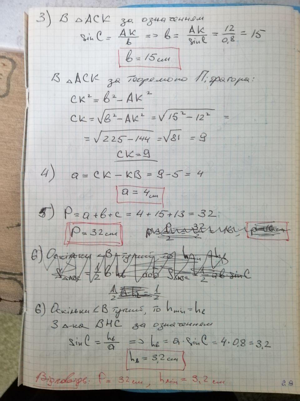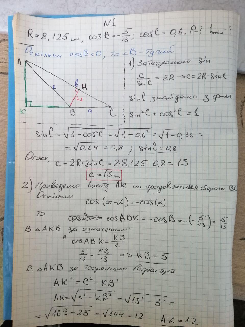 У трикутнику ABC R =8,125, cos В= -5/13, cos C = 0,6. Знайдіть периметр трикутника та найменшу його висоту