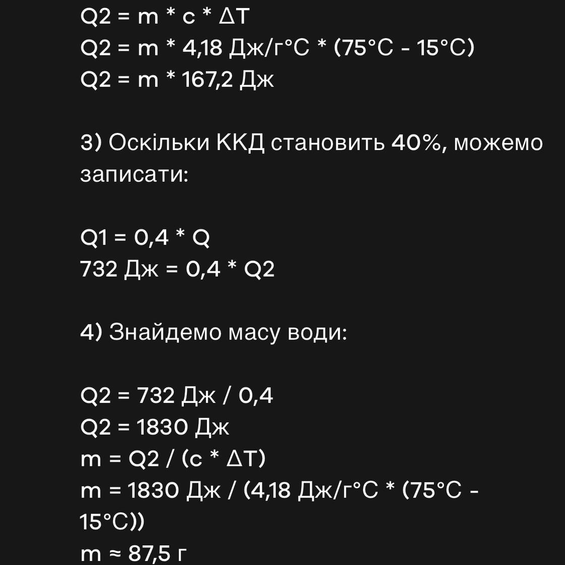 15° С до 75° С. При цьому згоріло 4 г спирту, е ККД спиртівки 40 %. Яку масу води нагріли.