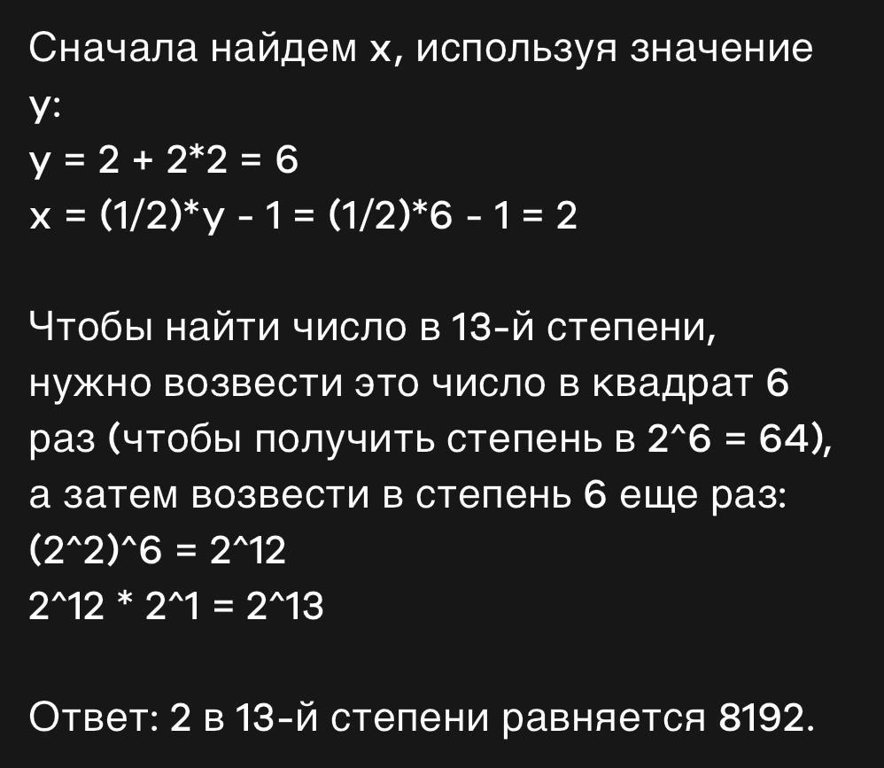 дам 120 балов! у=2+2*2 х= в два рази меншк ніж у, і -1 чому буде дорівгювати це число у 13 степені?