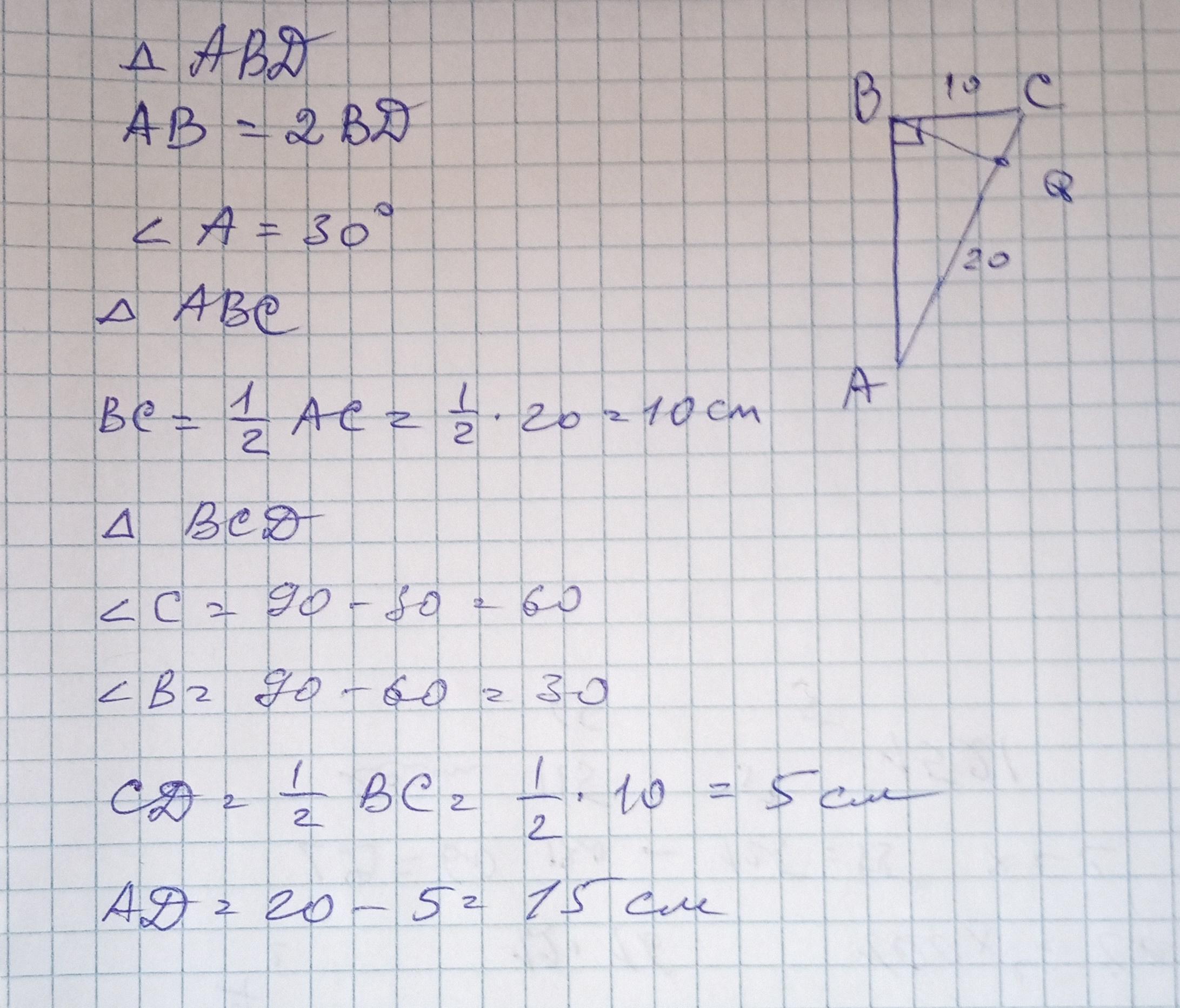 Катет ВD в два раза меньше гипотенузы АВ, угол против катета ВD ∠А=30°;