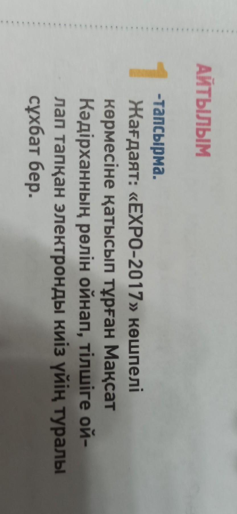 АЙТЫЛЫМ 1 -тапсырма. Жағдаят: «ЕХРО-2017» көшпелі көрмесіне қатысып тұрған Мақсат Кәдірханның рөлін ойнап, тілшіге ой- лап тапкан электронды киіз үйің туралы сұхбат бер.