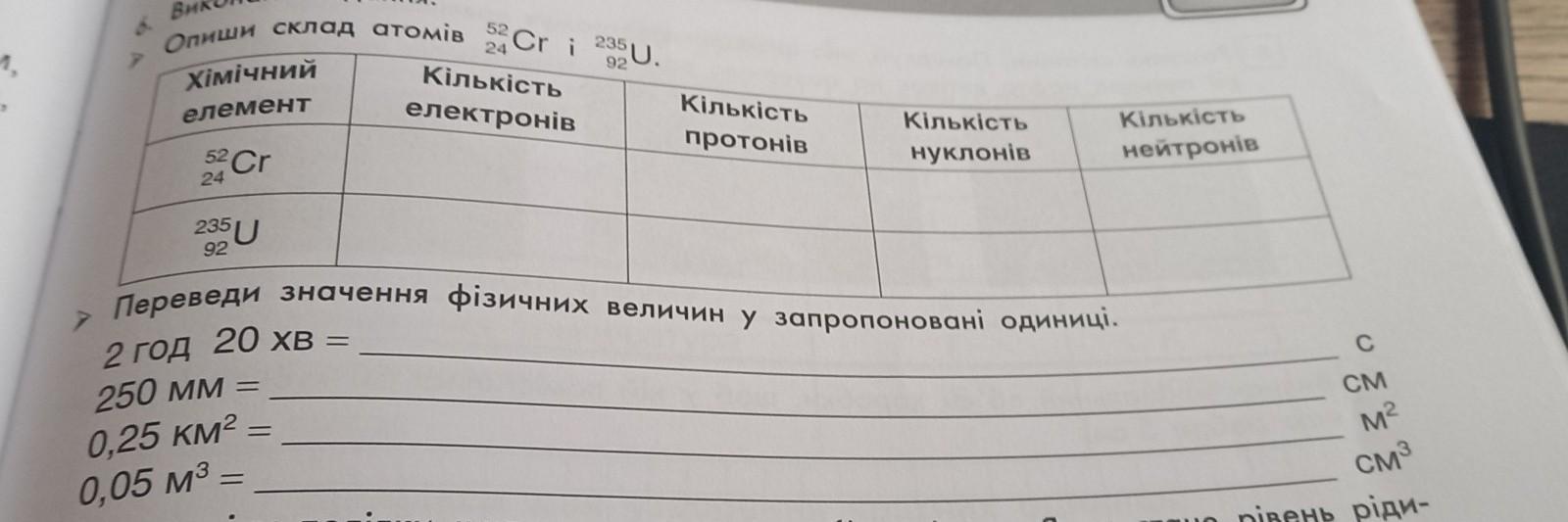 235 Опиши склад атомів Cr i U Хімічний елемент Cr 235U Кiлькiсть електронів - Кiлькiсть протонів Кiлькiсть нуклонів Переведи значення фізичних величин у запропоновані одиниці. 2 год 20 хв = 250 мм= 0,25 км² 0,05 м Кiлькiсть нейтронів пж даю 50б