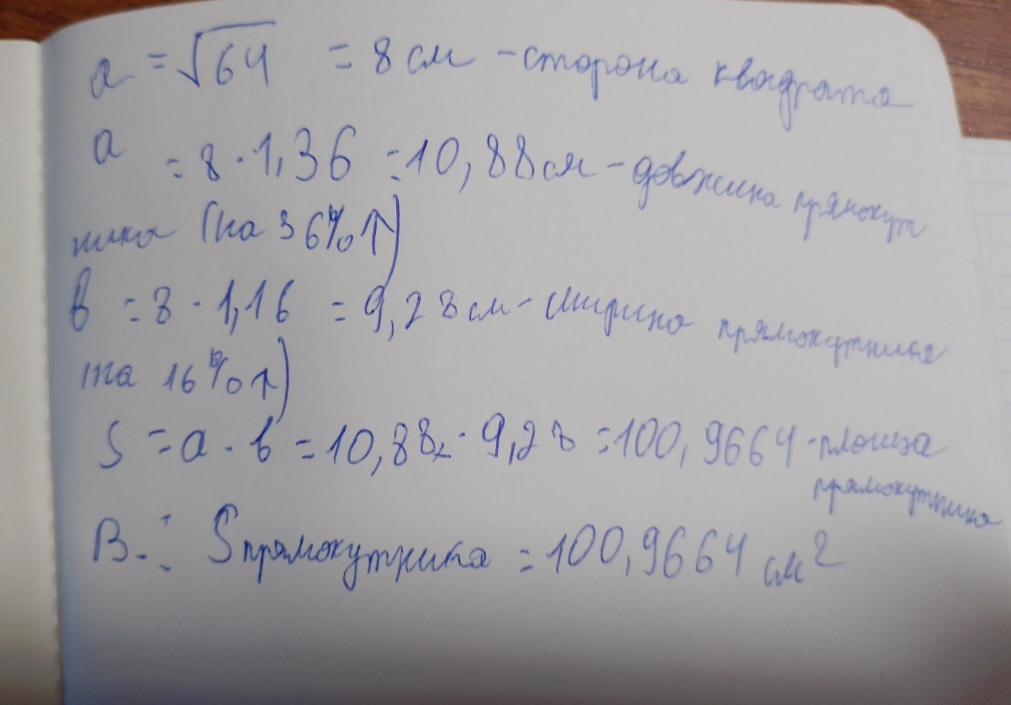 Обчислити площу прямокутника, довжина якого на 36% більша, а ширина на 16% більша, ніж сторона квадрата, площа якого дорівнює 64см2