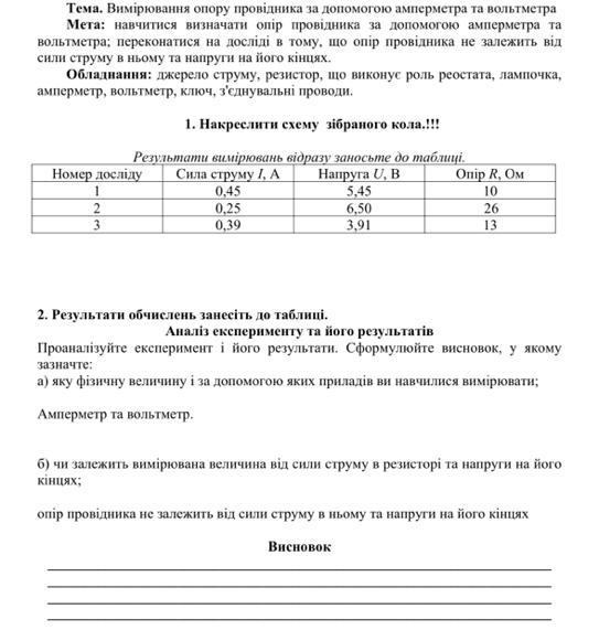 В результаті цієї лабораторної роботи було встановлено, що опір провідника залежить від його матеріалу та геометричних розмірів, але не залежить від сили струму в ньому та напруги на його кінцях. Таким чином, лабораторна робота допомогла нам краще зрозуміти фізичну природу опору провідника.