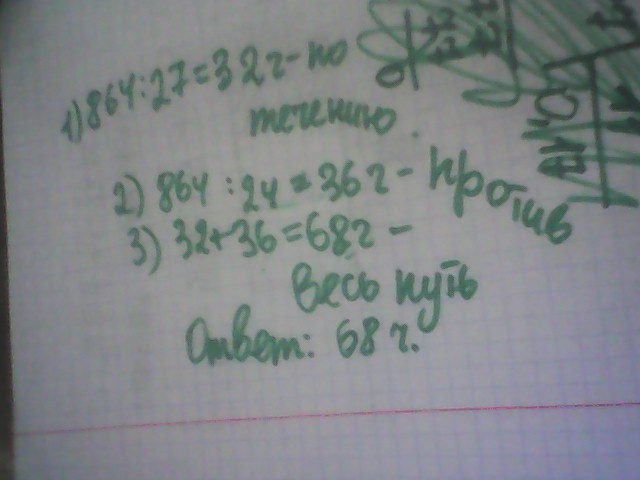со скоростью 27 км час а обратный путь против течения со скоростью 24 км час за сколько часов прошел весь путь теплоход туда и обратно?