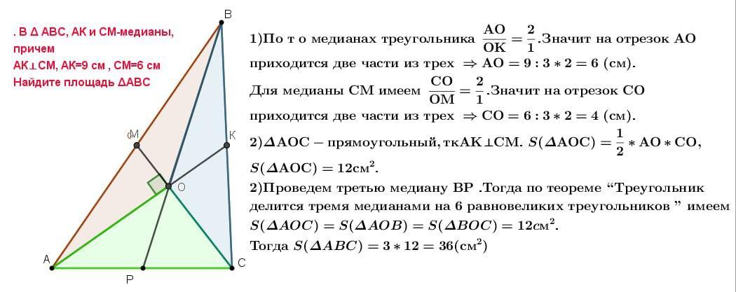 Медиана АК делит треугольник ∆АВС на два равновеликих треугольника S(∆КАС)=S(∆BKA)