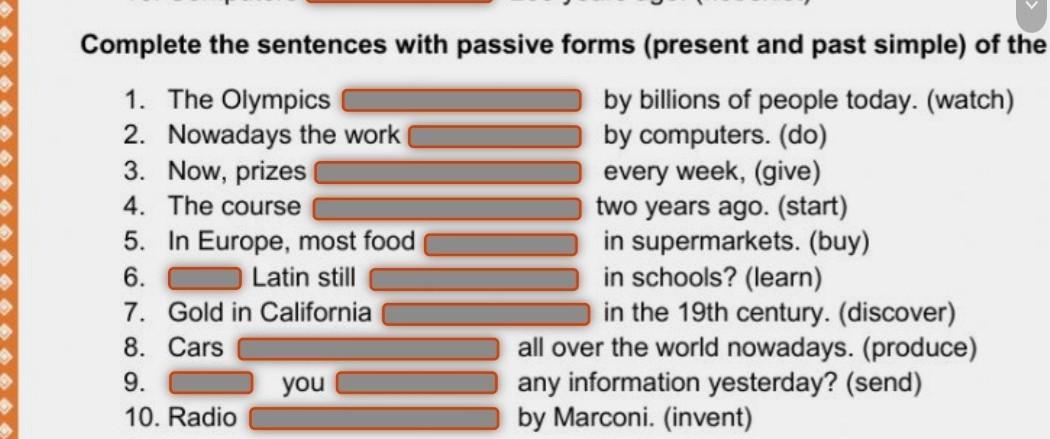 Complete the sentences with passive forms (present and past simple) of the 1. The Olympics 2. Nowadays the work 3. Now, prizes 4. The course 5. In Europe, most food Latin still 6. 7. Gold in California 8. Cars 9. 10. Radio you by billions of people today. (watch) by computers. (do) every week, (give) two years ago. (start) in supermarkets. (buy) in schools? (learn) in the 19th century. (discover) all over the world nowadays. (produce) any information yesterday? (send) by Marconi. (invent)