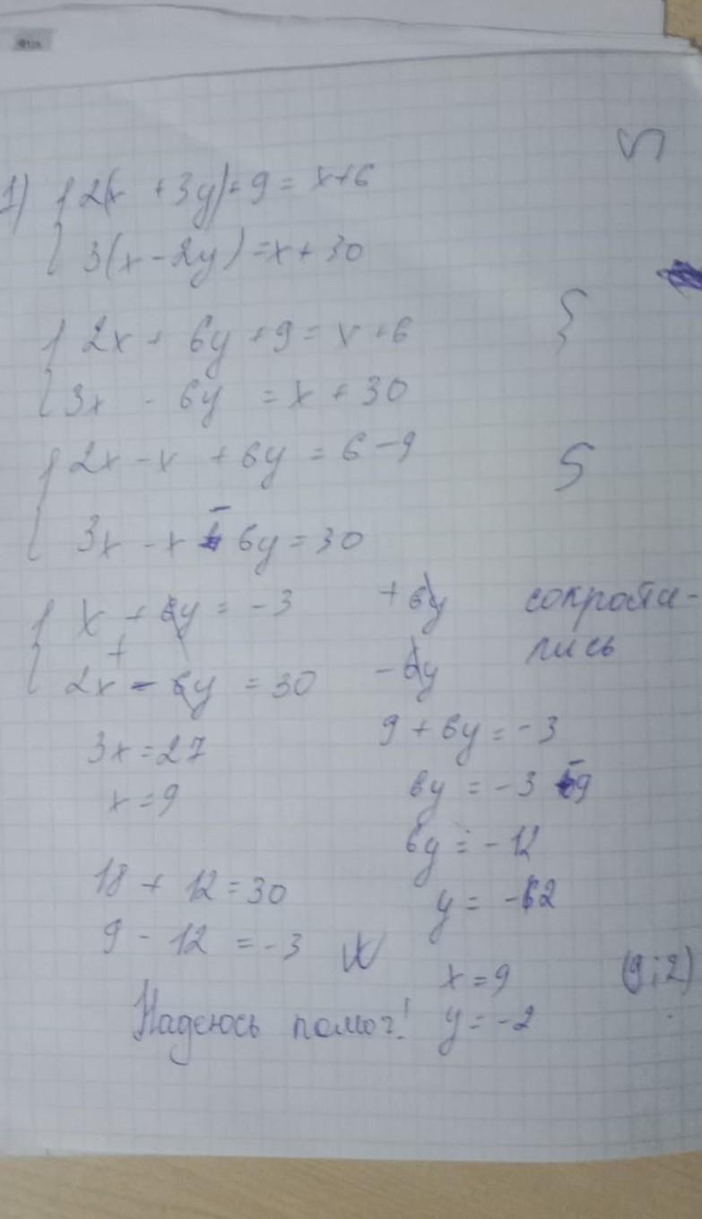 Решите системы уравнений спосо 1476. 1) [2(x+3y) + 9 = x + 6, 3(x-2y) = x + 30; 2) [5 (3x+2) = 7+12y, 4(x+y) +x=31; 3