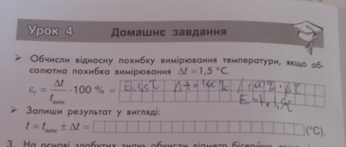 Урок 4 Домашне завдання > Обчисли відносну похибку вимірювання температури, якщо об- солютна похибка вимірювання ∆t=1,5 °С. At - 100 % - ELAST и+ + 100 % 100% Et ils C - Extelist ВИМ результат у вигляді: & - Т > Запиши t = tow t At ВИМ вс 65 (°C).