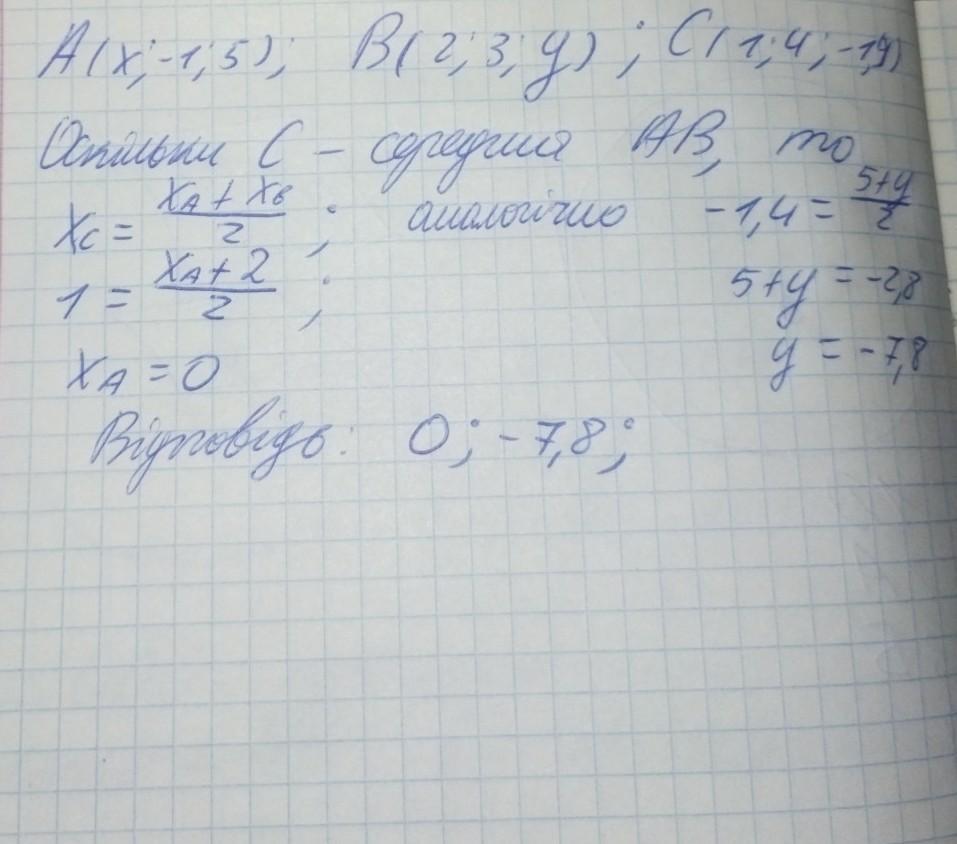 Точка С(1,4; -1,4) середина відрізка АВ. Знайти невідомі координати точок A(х; -1,5) і В(2,3; y).