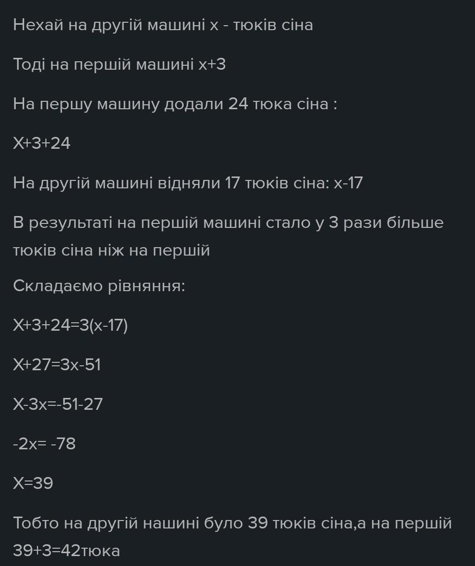першу машину довантажили 24 тюки, а з другої забрали 17, то на пер- шій машині стало утричі більше тюків, ніж на другій. Скільки тюків ci-