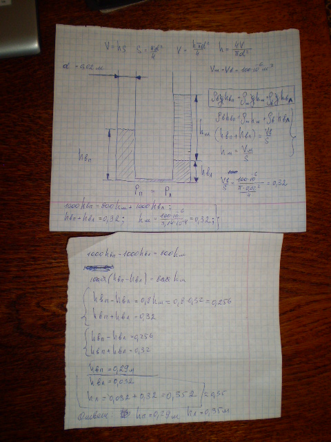 Колена сообщающихся сосудов представляют собой вертикально расположенные трубки диаметром d = 2 см каждая. В одно из колен заливают сначала воду объёмом V = 100 мл, а затем -такой же объём масла. Определите уровни жидкостей в коленах. Объёмом изогнутой части трубок пренебречь. Плотность масла ро1 = 800 кг/м3, плотность воды ро2 = 1000 кг/м3.