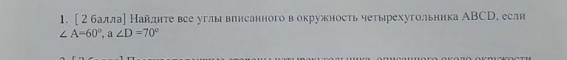 1. Найдите все углы вписанного в окружность четырехугольника ABCD. если < A=60°, a < D=70º