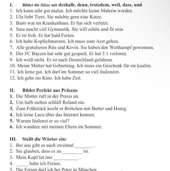 1) Bilde die Sätze mit Konjunktionen dass, weil, denn, wenn, deshalb, trotzdem.