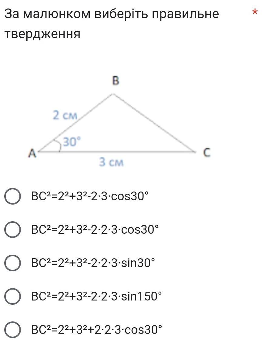 За малюнком виберіть правильне твердження A 2 см 30° В 3 см BC2=22+32-2·3·cos30° BC2=22+32-2·2.3.cos30° BC2=22+32-2·2·3·sin30° BC2=22+32-2·2.3.sin150° ( BC2=22+32+2·2-3·cos30° C *