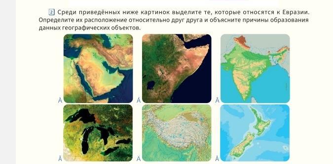 Среди приведённых ниже картинок выделите те, которые относятся к Евразии.Определите их расположение относительно друг друга и объясните причины образования данных географических объектов.