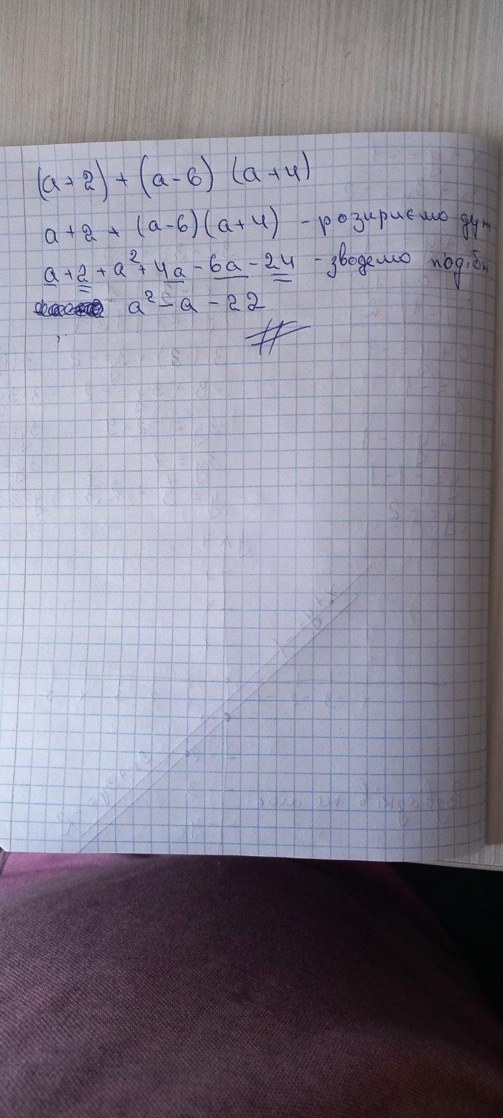 Для спрощення виразу (a+2)+(a-6)(a+4), розгорнемо дужки і скористаємося правилами алгебри: