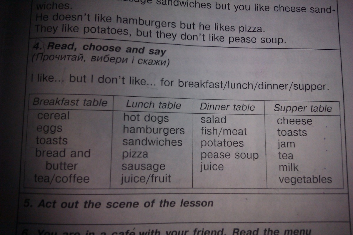 Тебе нужно прочитать названия блюд для разных приёмов пищи и сказать(написать) по образу что ты любишь, а что нет на завтрак, на обед и т.д.