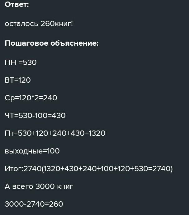 МАТЕМАТИКА В ЖИЗНИ 5 Реши задачу. в книжном интернет-магазине было 3 000 экземпляров на- учной фантастики. На этой неделе в понедельник продали 530 книг, во вторник 120. В среду - в 2 раза больше, чем во вторник. В четверг - на 100 книг меньше, чем в понедель- ник. В пятницу — столько, сколько за период с понедельника по четверг. В выходные ещё 100 книг. Остались ли ещё экземпляры научной фантастики в магазине и сколько? помогите даю 50баллов