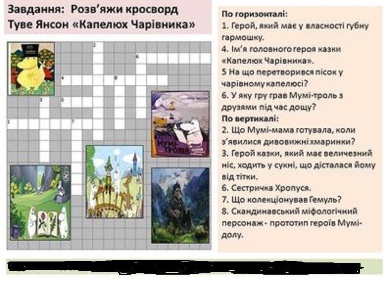 Відповідь: 1. Нюхмумрик. 2. запіканка. 3. Гемуль. 4. мумі-троль. 5. вода. 6. хованки. 7. рослини. 8. троль