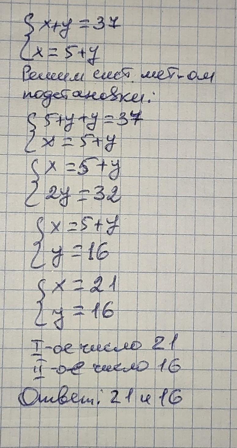 37-5=32, 32:2=16, 16+5=21, первое число:21, второе число:16