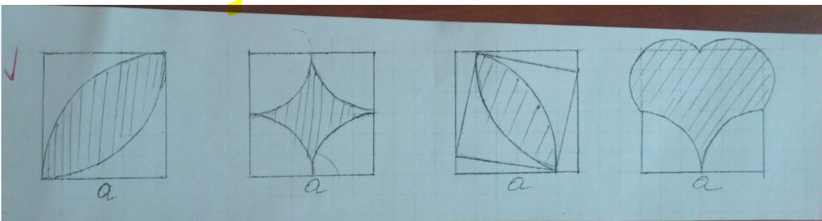 В первой фигуре нарисованы две четвертинки кругов с радиусами а. Они пересекаются. Поделим заштрихованную часть диагональю квадрата пополам.