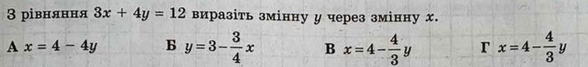 З рівняння 3х + 4у = 12 виразіть змінну у через змінну х. 4
