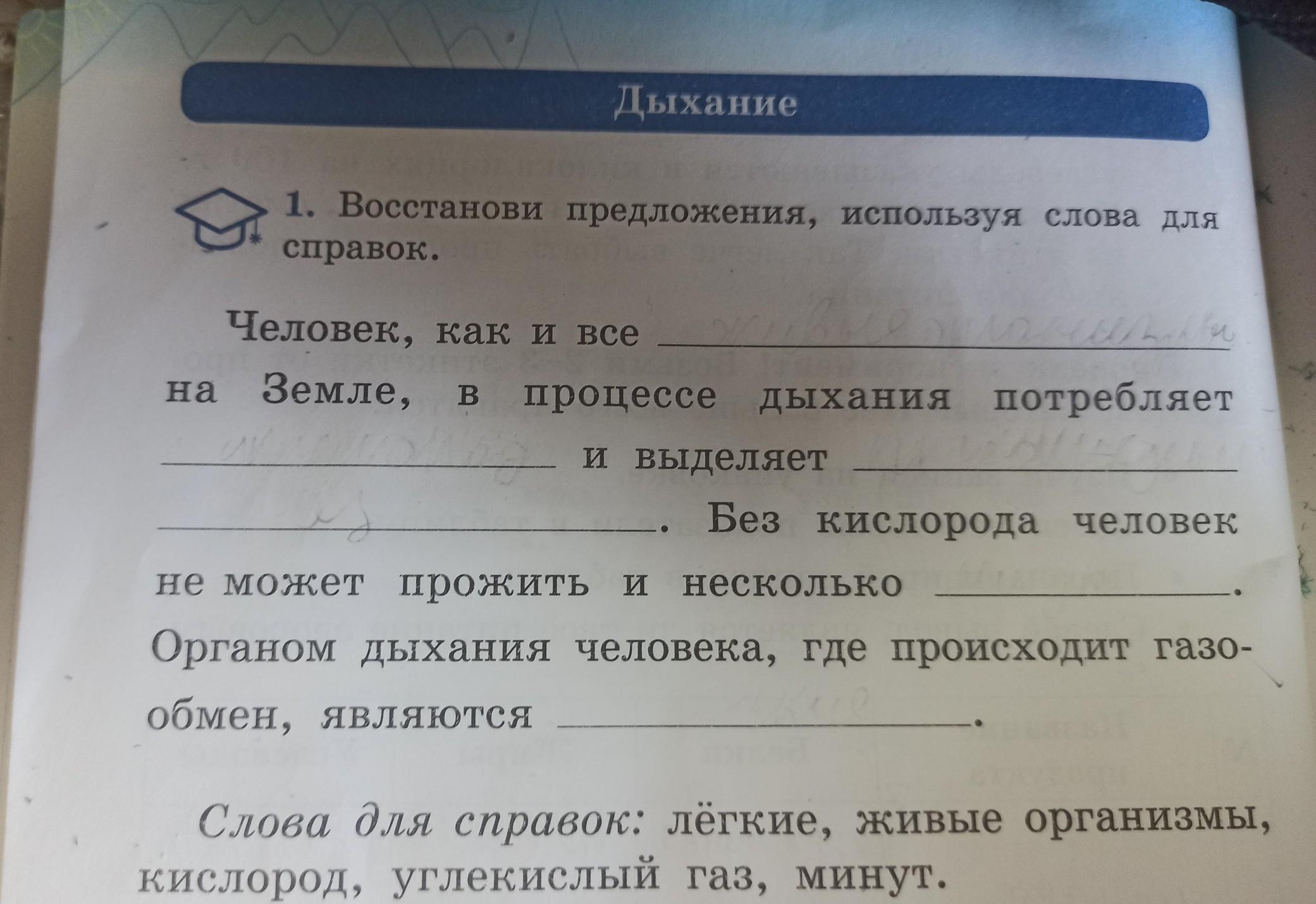 слова для справок: лёгкие живые организмы кислород углекислый газ минут