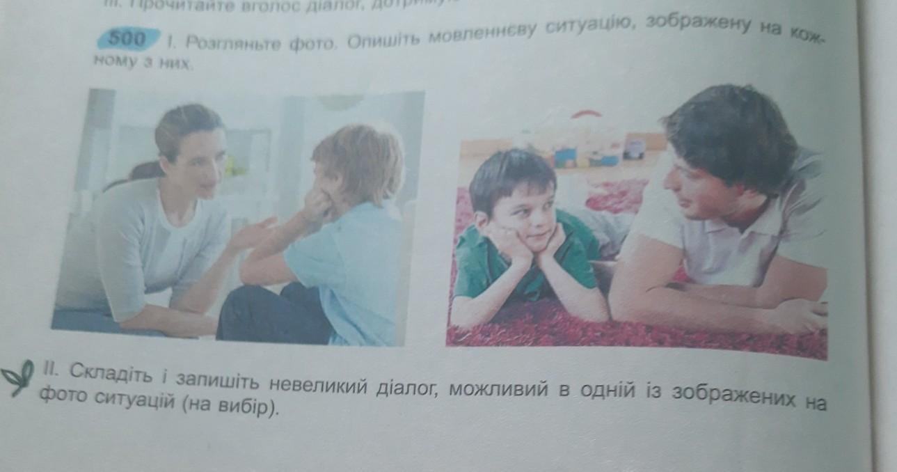 1. Розгляньте фото. Опишіть мовленнєву ситуацію, зображену на кожному з них II. Складіть і запишіть невеликий діалог, можливий в одній із зображених на фото ситуацій (на вибір).