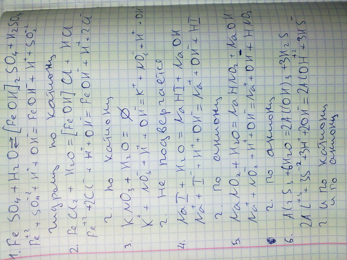 Какие из солей : Fe2(SO4)3, FeCl2, KNO3, NaJ, NaNO2, Al2S3 - подвергаются гидолизу и какова его форма(простой, ступенчатый, полный)? Составьте молекулярные и ионные уравнения реакций.Какое значение pH имеют растворы этих солей?
