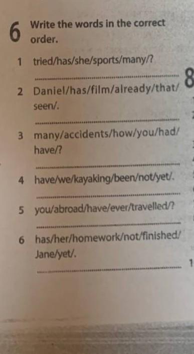 3 many/accidents/how/you/had/ have/? 4 have/we/kayaking/been/not/yet/.