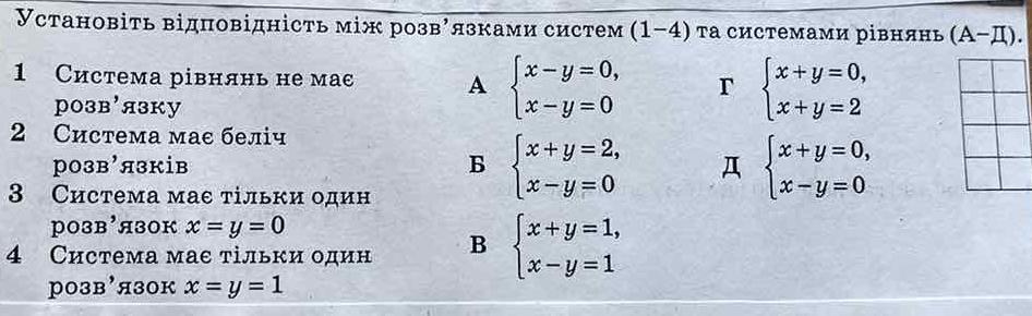 Установіть відповідність між розв'язками систем (1-4) та системами рівнянь (А-Д).