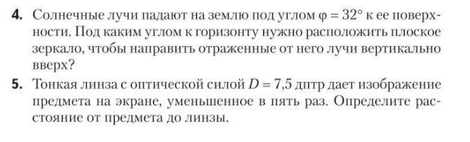 4. Солнечные лучи падают на землю под углом ф = 32° к ее поверх- ности. Под каким углом к горизонту нужно расположить плоское зеркало, чтобы направить отраженные от него лучи вертикально вверх? 5. Тонкая линза с оптической силой D = 7,5 дптр дает изображение предмета на экране, уменьшенное в пять раз. Определите рас- стояние от предмета до линзы. Срочно!!