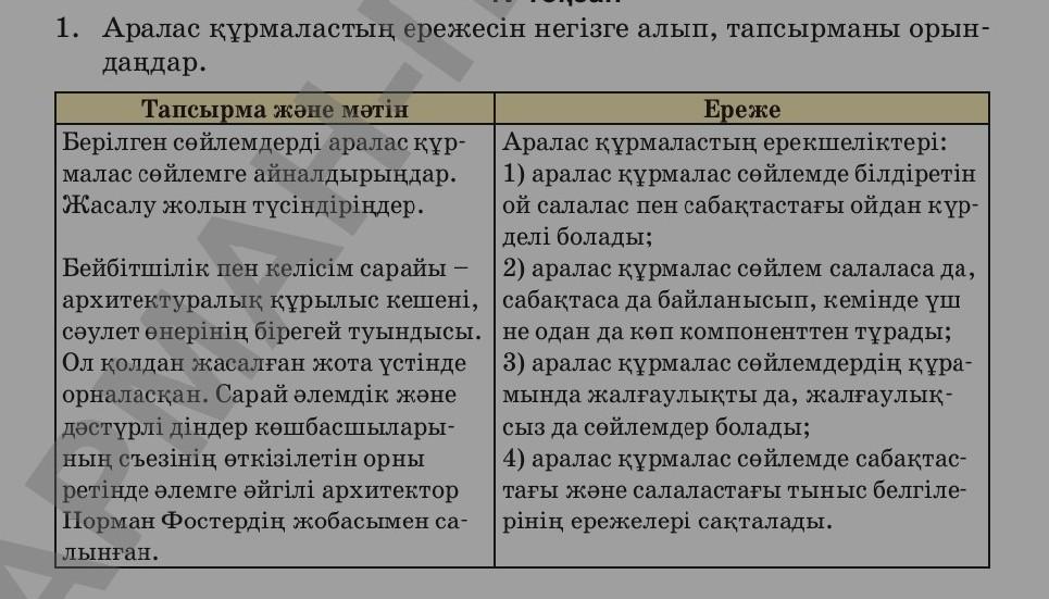 1. Аралас құрмаластың ережесін негізге алып, тапсырманы орын- дандар. Тапсырма және мәтін Берілген сөйлемдерді аралас құр- малас сөйлемге айналдырыңдар. Жасалу жолын тусiндiрiндер. Бейбітшілік пен келісім сарайы - архитектуралык кұрылыс кешені, сәулет өнерiнiң бiрегей туындысы. Ол колдан жасалған жота үстінде орналасқан. Сарай әлемдік және дәстүрлі діндер көшбасшылары- ның съезінің өткізілетін орны ретінде әлемге әйгілі архитектор Норман Фостердiң жобасымен са- лынган. Epeжe Аралас құрмаластын ерекшеліктері: 1) аралас құрмалас сөйлемде білдіретін ой салалас пен сабақтастағы ойдан күр- делi болады; 2) аралас құрмалас сөйлем салаласа да, сабақтаса да байланысып, кемінде үш не одан да коп компоненттен тұрады; 3) аралас құрмалас сөйлемдердің құра- мында жалғаулықты да, жалғаулық- сыз да сойлемдер 4) аралас құрмалас сөйлемде сабақтас- тағы және салаластагы тыныс белгіле- рiнiң ережелерi сакталады. ДАЮ 100 БАЛЛОВ
