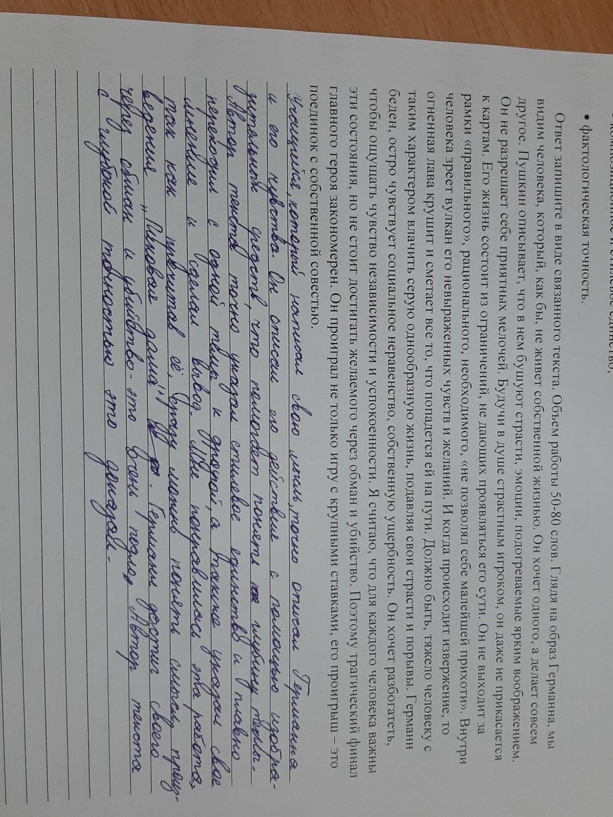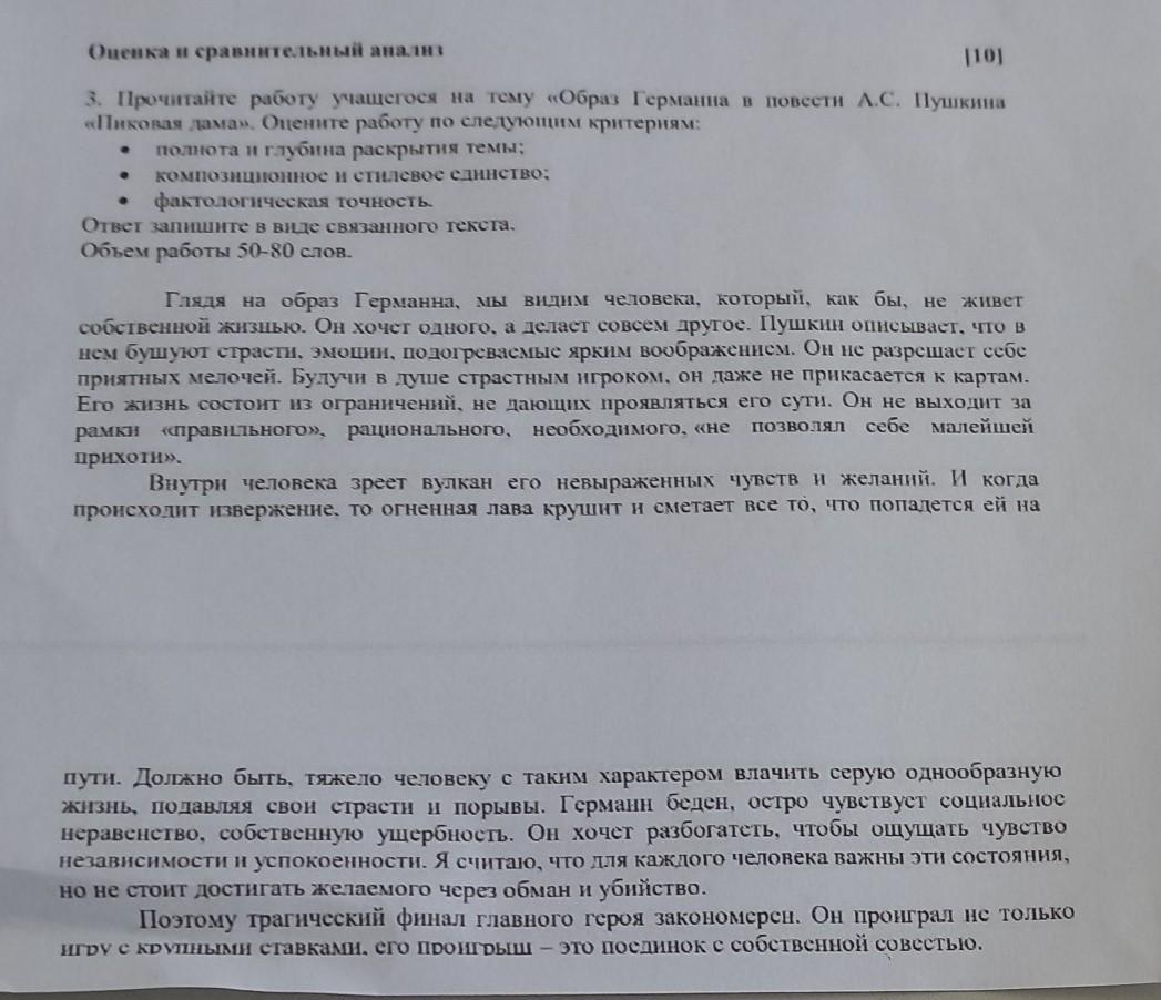 Оценка и сравнительный анализ [10] 3. Прочитайте работу учащегося на тему «Образ Германна в повести А.С. Пушкина «Пиковая дама». Оцените работу по следующим критериям: ● полнота и глубина раскрытия темы: ● композиционное и стилевое единство: фактологическая точность. Ответ запишите в виде связанного текста. Объем работы 50-80 слов. О Глядя на образ Германна, мы видим человека, который, как бы, не живет собственной жизнью. Он хочет одного, а делает совсем другое. Пушкин описывает, что в нем бушуют страсти, эмоции, подогреваемые ярким воображением. Он не разрешает себе приятных мелочей. Будучи в душе страстным игроком, он даже не прикасается к картам. Его жизнь состоит из ограничений, не дающих проявляться его сути. Он не выходит за позволял себе малейшей рамки «справильного», рационального, необходимого, «не прихоти». Внутри человека зреет вулкан его невыраженных чувств и желаний. И когда происходит извержение, то огненная лава крушит и сметает все то, что попадется ей на пути. Должно быть, тяжело человеку с таким характером влачить серую однообразную жизнь, подавляя свои страсти и порывы. Германн беден, остро чувствует социальное неравенство, собственную ущербность. Он хочет разбогатеть, чтобы ощущать чувство независимости и успокоенности. Я считаю, что для каждого человека важны эти состояния, но не стоит достигать желаемого через обман и убийство. Поэтому трагический финал главного героя закономерен. Он проиграл не только игру с крупными ставками. его проигрыш это поединок е собственной совестью.