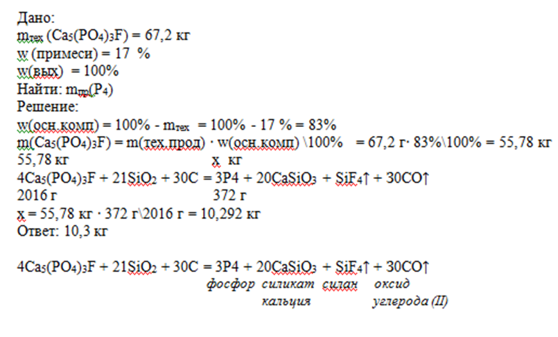 Фторопатит Ca5(PO4)3F массой 67,2 кг, содержащий 17 % примесей, сплавили с оксидом кремни и углем. Какую массу белого фосфора получили в этой реакции? Какие еще ценные вещества получены в этой реакции? Выход реакции считать равным 100 %.