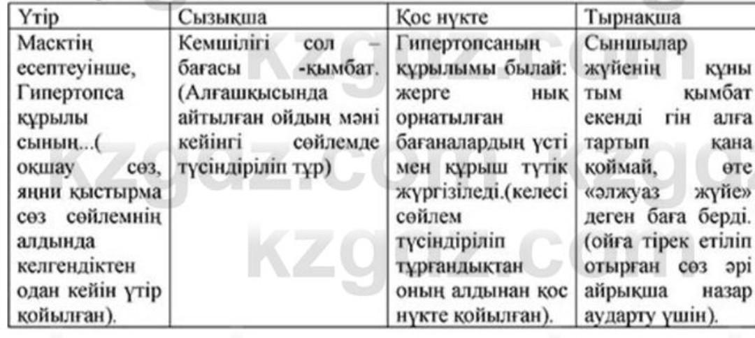 Берілген мәтіндегі тыныс белгілердің қойылу себебін кестеге түсіріңдер. Үлгі: Yrip Сызықша Кемшілігі сол - бағасы қымбат. (Алғашқысында ай- тылған ойдың мәні кейінгі сөйлемде түсіндіріліп тұр) Қос нүкте Тырнақша