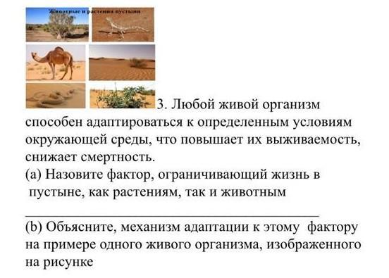 Животные и растения пустын 3. ЛЮБОЙ Живой организм способен адаптироваться к определенным условиям окружающей среды, что повышает их выживаемость, снижает смертность. (а) Назовите фактор, ограничивающий жизнь в пустыне, как растениям, так и животным (b) Объясните, механизм адаптации к этому фактору на примере одного живого организма, изображенного на рисунке