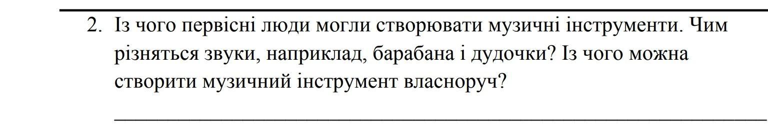 2. Із чого первісні люди могли створювати музичні інструменти. Чим різняться звуки, наприклад, барабана і дудочки? Із чого можна i створити музичний інструмент власноруч?