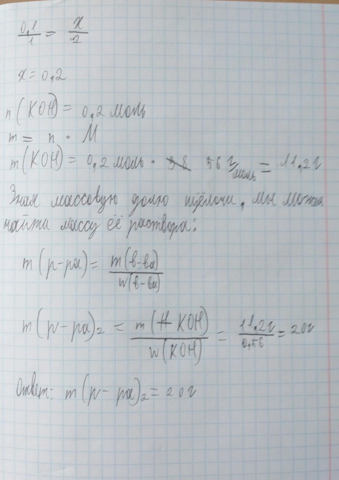 Раствор массой 49г с массовой долей серной кислоты 20% полностью нейтрализовали раствором гидроксида калия с массовой долей щелочи 56%. Определите массу (2) раствора щелочи, взятого для реакции.